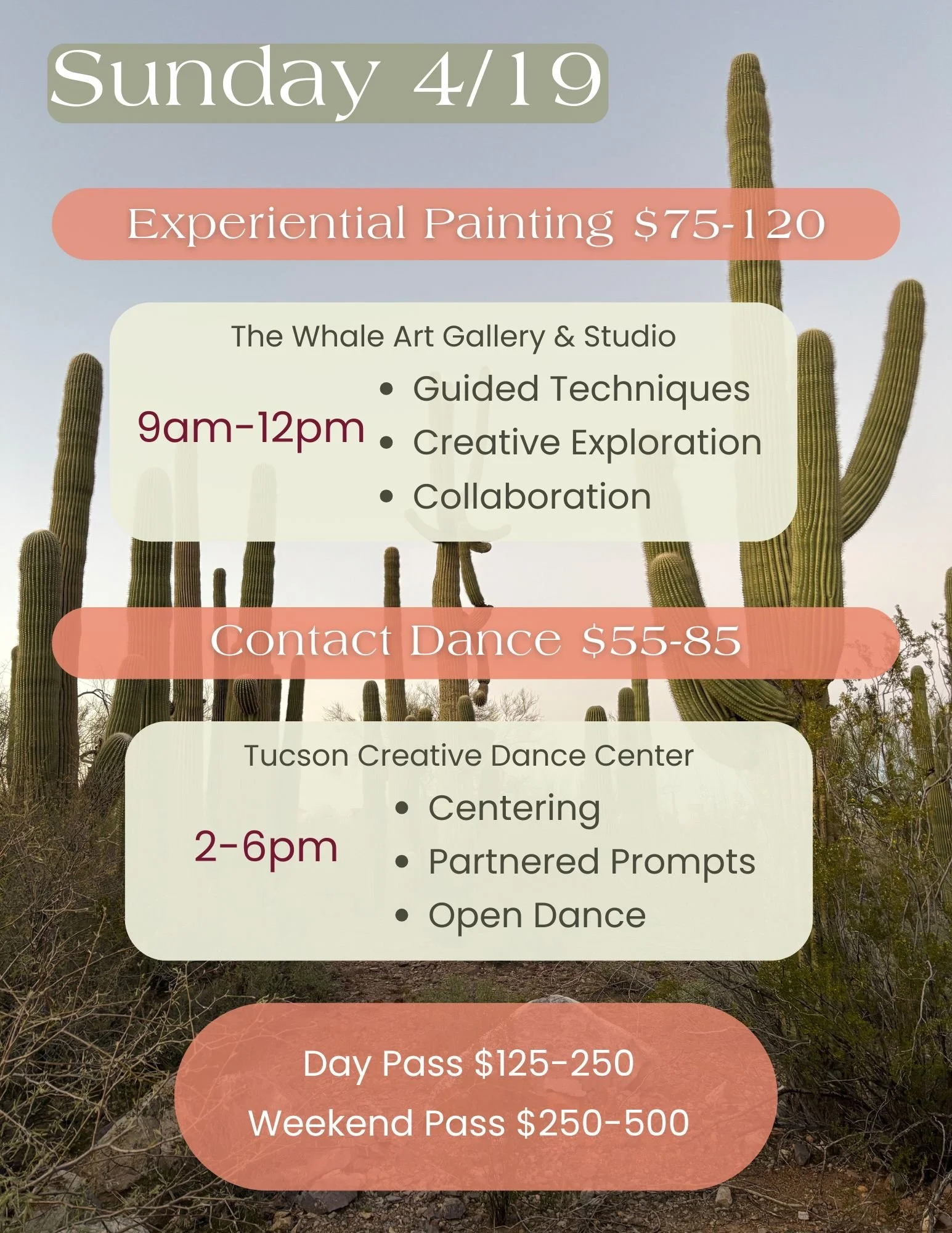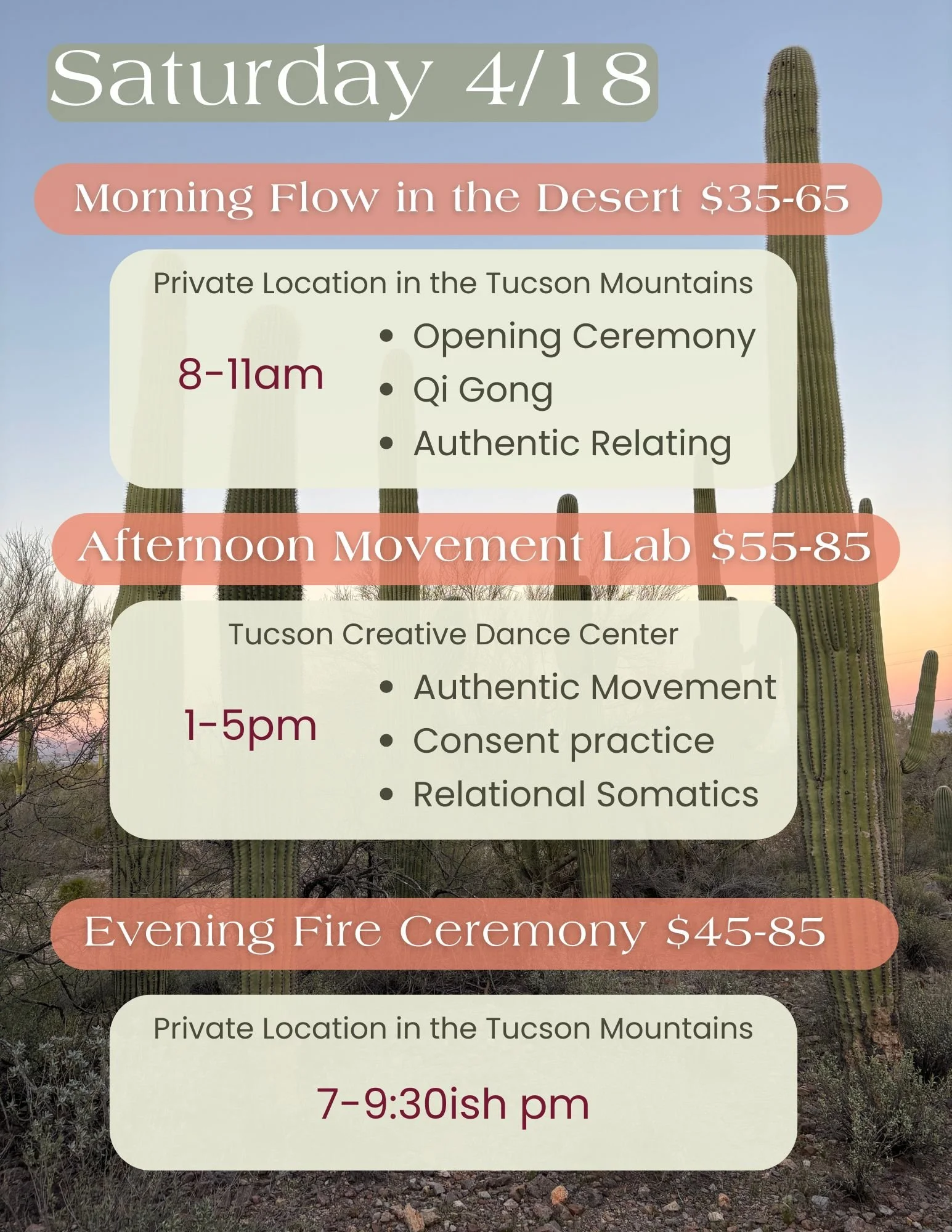 In the morning we will meet at a private location in the desert and set the container for the weekend together. In the afternoon we will meet at the Tucson Creative Dance Center for some guided movement practices, authentic relating and witnessing.